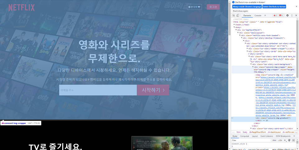 우선 넷플릭스 페이지에서 개발자 도구를 켜서 이미지의 주소를 알아낸다.
