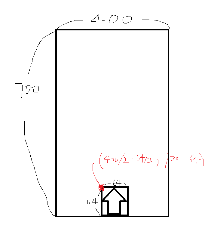 우리는 게임화면을 400px, 700px로 설정해 놓은 상태이고 우주선의 크기는 64x64이다.