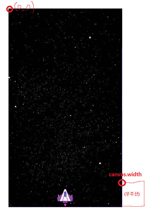 만약 canvas.width, canvas.height로 주게 되면 아래 사진과 같이 우주선이 밖으로 나가기 때문이다.