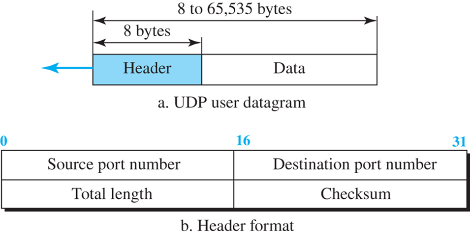 사용자 데이터그램이라고 부르는 UDP 패킷은 각각 2바이트인 4개의 필드로 만들어진 고정된 크기의 8바이트 헤더를 보유하고 있다.