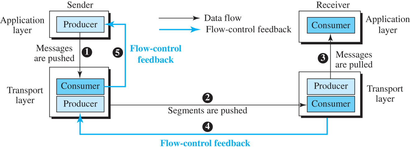 - 흐름 제어 피드백은 수신 TCP에서 송신 TCP로, 그리고 송신 TCP에서 송신 프로세스로 이동(경로 4, 5).