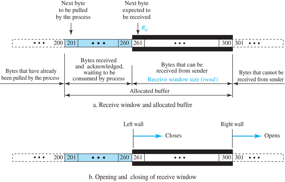 - 흰색 : 추가적으로 수신할 수 있는 버퍼 영역 - 검정색 : 수신창 크기 - Rn : 다음에 수신 예정인 바이트(261) - 전체 버퍼 영역 : 하늘색 + 검정색 |