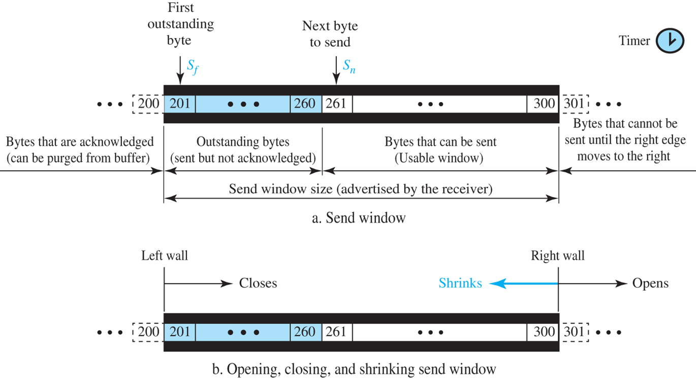 - TCP는 데이터 전송을 위한 각 방향에 대해서 2개의 창(송신 창, 수신 창)를 사용하며 따라서 양방향 통신을 위하여 4개의 창이 필요 - 하지만 간단한 설명을 위해 통신이 단방향(클라이언트로부터 서버로)으로 이루어지는 상황을 고려