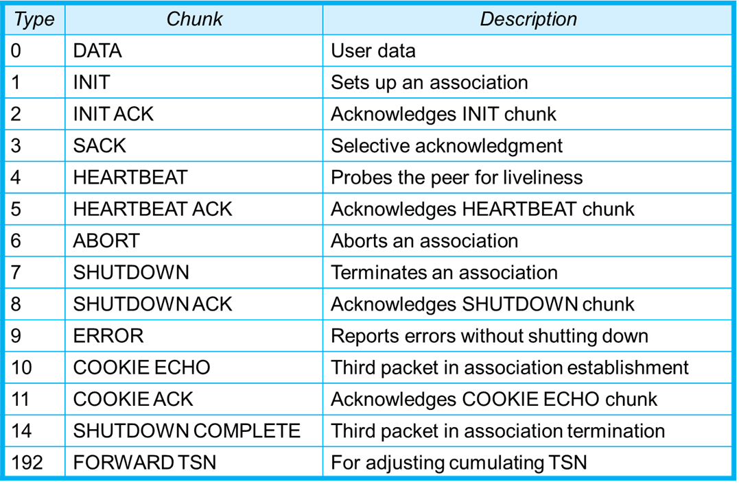 예를 들어, INIT 제어 칭크는 INIT ACK 청크로 확인응답이 된다. 순서 번호나 확인응답 번호가 필요가 없다.