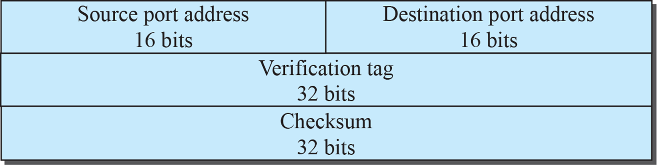 - 발신지와 목적지 포트 번호는 UDP나 TCP와 동일하다. - 검증 태그(verification tag)는 32비트 필드로 패킷을 결합과 일치시킨다. - 이것은 이전의 결합으로부터 온 패킷이 이 결합에 패킷을 잘못 받아들여지는 것을 방지한다. 결합을 위한 식별자로 사용한다. 결합 동안에 모든 패킷에서 반복된다. - 결합에는 각 방향을 위해 사용되는 별도의 검증 태그가 있다. |