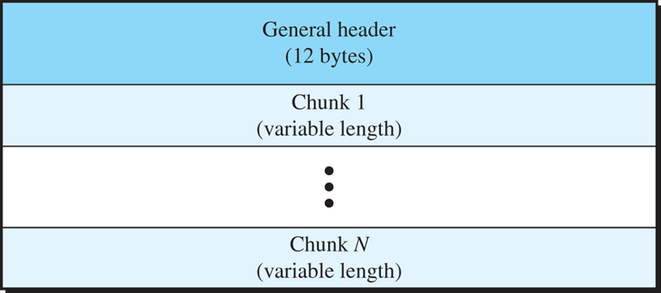 SCTP 패킷은 필수 항목의 일반 헤더와 청크로 불리는 블록 잡합들을 가진다.