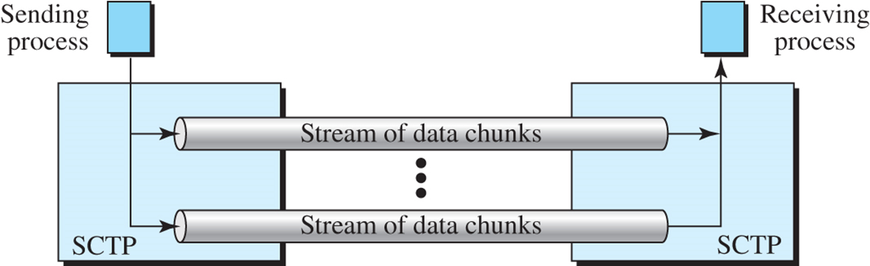 - SCTP는 여러 개의 스트림을 지원할 수 있으며, 이것은 송신기 프로세스는 서로 다른 스트림을 정의할 수 있고, 하나의 메시지는 이러한 스트림의 하나에 속할 수 있다는 것을 의미한다. - 각 스트림에는 스트림을 유일하게 정의하는 스트림 식별자(SI)가 할당된다. 그러나 SCTP는 각 스트림에 순서 있는(ordered, 기본)과 순서 없는(unordered) 두 가지 유형의 데이터 전달을 지원한다. - 순시화된 데이터 전달은 스트림에 데이터 청크가 순서를 정의하기 위해 스트림 순서 번호(SSN)를 사용한다.