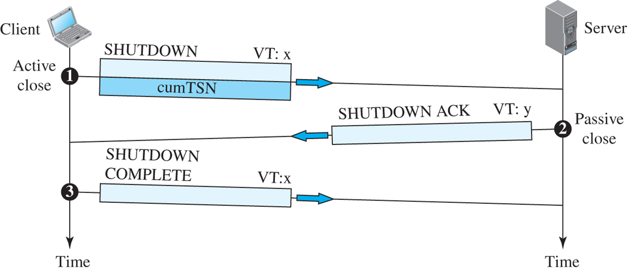 SCTP에서는 TCP처럼 데이터를 교환하고 있는데 (클라이언트 또는 서버) 참여한 2개의 어느 쪽도 연결을 폐쇄할 수 있다.