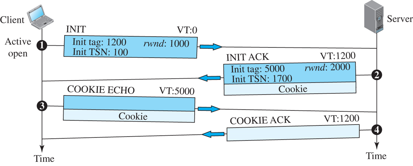 3. 클라이언트 COOKIE ECHO 청크를 포함하는 세 번째 패킷을 송신한다. - 이것은 서버에 의해 송신된 쿠키를 변경 없이 반향시키는 아주 간단한 청크이다. SCTP는 이 패킷에 데이터 청크를 포함시키는 것을 허용한다. 4. 서버는 COOKIE ECHO 청크의 수신에 대한 확인응답을 하는 COOKIE ACK 청크를 포함한 네 번째 패킷을 송신한다. - SCTP는 이 패킷을 가지고 데이터 청크를 포함시키는 것을 허용한다.