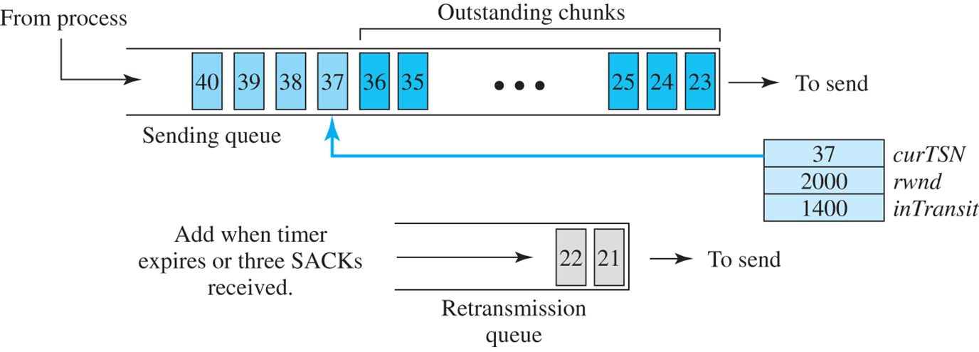 - 송신 큐는 23에서 40까지 청크를 유지한다. 23에서 36까지 청크는 이미 송신되었고 그러나 아직 확인응답이 되지 않았다. 미해결 청크들이다. - curTSN은 송신되어야 하는 다음 청크를 가리킨다(37). 각 청크는 100바이트라고 가정하면 이것은 1,400데이터 바이트(23부터 36까지의 청크)가 이동 상태에 있는 것을 의미한다. 이때에는 송신기가 재전송 큐를 가진다. - 패킷이 송신될 때 재전송 타이머가 그 패킷(패킷에 있는 모든 데이터 청크)을 위하여 시작한다. 어떤 구현 방법에서는 전체 결합을 위하여 하나의 단일 타이머를 사용한다. 그러나 간단하게 하기 위하여 각 패킷에 하나의 타이머를 가진 관례를 따른다. - 패킷에 대한 재전송 타이머가 끝날 때 또는 손실(TCP를 위해 설명한 빠른 재전송)로써 패킷을 선언하는 4개의 중복 SACK 도착하면 패킷 안에 있는 청크들은 재송신되기 위하여 재전송 큐로 이동된다.