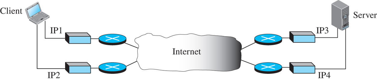 서버 또한 2개의 IP 주소를 가지고 2개의 네트워크에 연결된다. 클라이언트와 서버는 4개의 서로 다른 IP 쌍을 가지고 결합을 만들 수 있다. 그러나 현재의 SCTP 구현에서는 IP 주소 1개의 쌍만이 정상적인 통신을 위하여 선택된다는 것을 유념하라. - 다른 경로는 주 경로가 실패하면 사용된다.