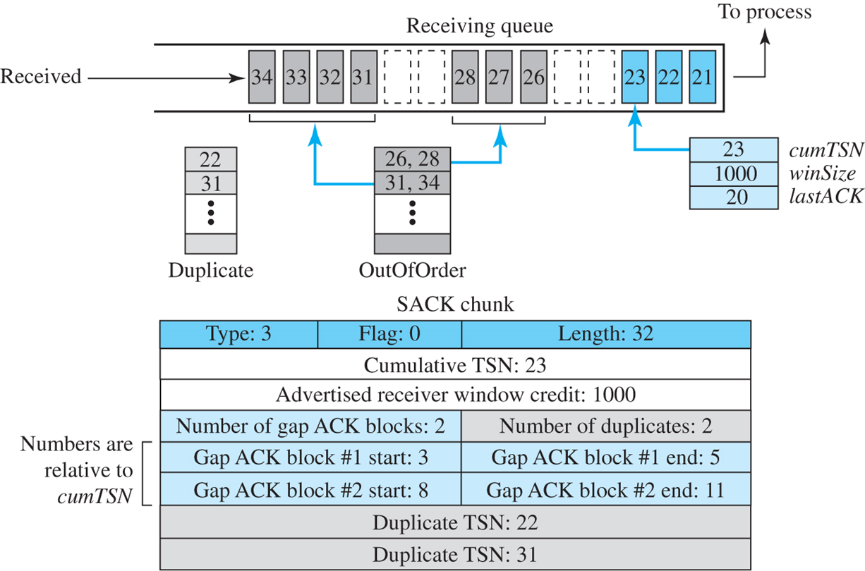 - 이용 가능한 창 크기는 1,000바이트이다. - 21에서 23까지 청크들이 순서대로 수신이 된다. - 첫 번째 순서 없는 블록은 26에서 28까지 청크들을 가지고 있다. - 두 번째 순서 없는 블록은 31에서 34까지 청크들을 포함한다. - 한 변수는 cumTSN 값을 유지한다. - 변수 배열은 순서가 없는 각 블록의 시작과 끝을 계속 추적한다. 변수 배열은 수신된 중복 청크를 유지한다. - 이 청크들은 버려질 것이기 때문에 큐에 중복 청크를 저장할 필요가 없다. - 그림은 또한 송신기에 수신기의 상태를 보고하기 위하여 송신될 SACK를 보여준다. 순서 없는 청크를 위한 TSN 번호는 누적된 TSN에 대해 상대적인(오프셋) 값이다. |