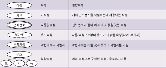 | 속성의 유형 단순 속성 - 속성값을 더 이상 작은 단위로 나눌 수 없는 속성 복합 속성 - 속성값을 작은 단위로 나눌 수 있는 속성 단일 속성 - 특정 속성에 대해 하나의 값만 허용 다중 속성 - 특정 속성에 대해 하나 이상의 값 허용 저장 속성 - 다른 속성의 영향 없이 단독으로 저장되는 속성 유도 속성 - 특정 속성의 값을 다른 관련된 속성들의 값으로부터 도출 가능한 속성 |