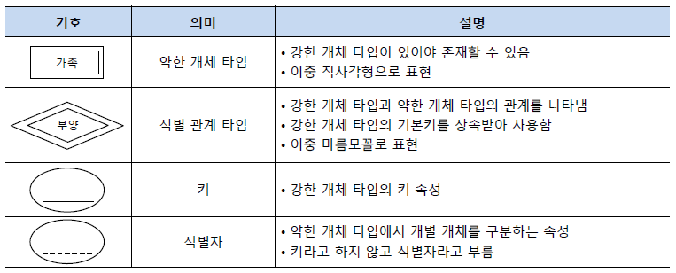 가족 개체 타입처럼 상위 개체 타입이 결정되지 않으면 개별 개체를 식별할 수 없는 종속된 개체 타입을 약한 개체 타입이라고 한다.