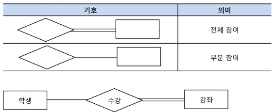 | 전체 참여 - 개체 집합의 모든 개체가 관계에 참여하고, 개체 타입과 관계를 두 줄 실선으로 표현 부분 참여 - 일부만 참여하며, 일반적인 관계 표현과 같이 단일 실선으로 표현 |