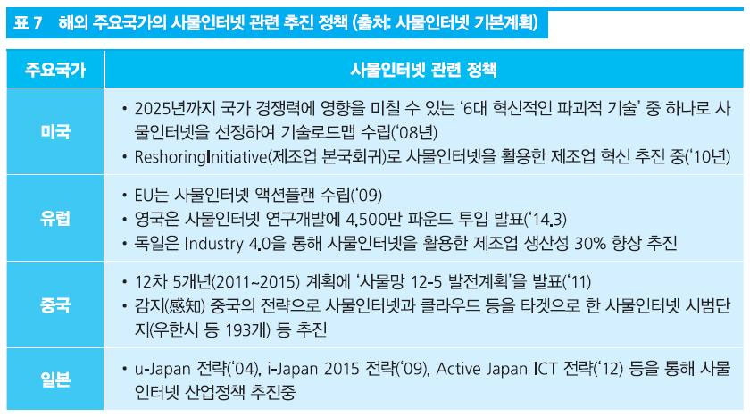 국내에서는 2013년부터 본격적으로 사물인터넷의 개념과 관련 사업에 대한 논의가 이루어진 반면, 해외의 경우는 우리나라보다 4~5년 먼저 관련 논의가 시작되었다.