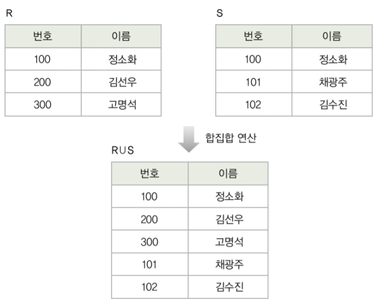 두 개의 릴레이션을 합하여 하나의 릴레이션을 반환한다.