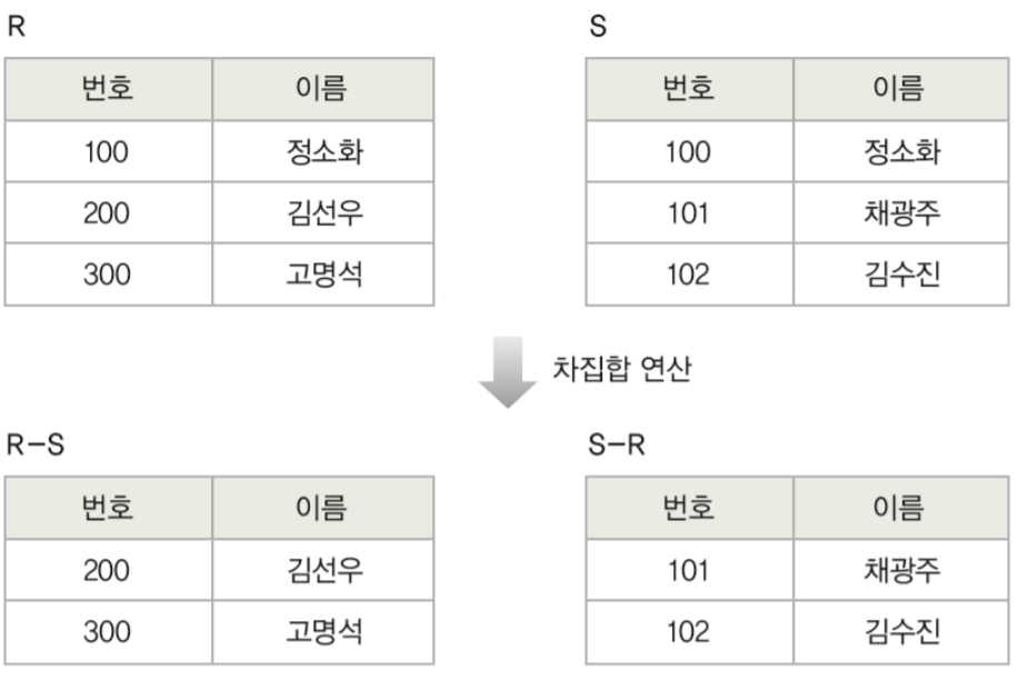 첫 번째 릴레이션에는 속하고 두 번째 릴레이션에는 속하지 않는 투플을 반환한다.