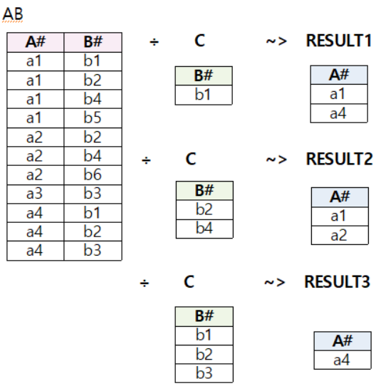 실제로 자주 사용하지 않으며 조인 연산을 통해 디비전 연산을 수행할 수 있다.