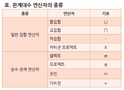 | 순수 관계 연산 1. 셀렉션 2. 프로젝션 3. 조인 4. 디비전 5. 개명 일반 집합 연산 1. 합집합 2. 교집합 3. 차집합 4. 카티션 프로덕트 |