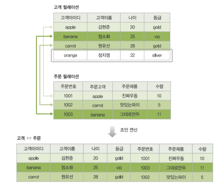 조인은 두 릴레이션의 공통 속성을 기준으로 속성값이 같은 투플을 수평으로 결합하는 연산이다.