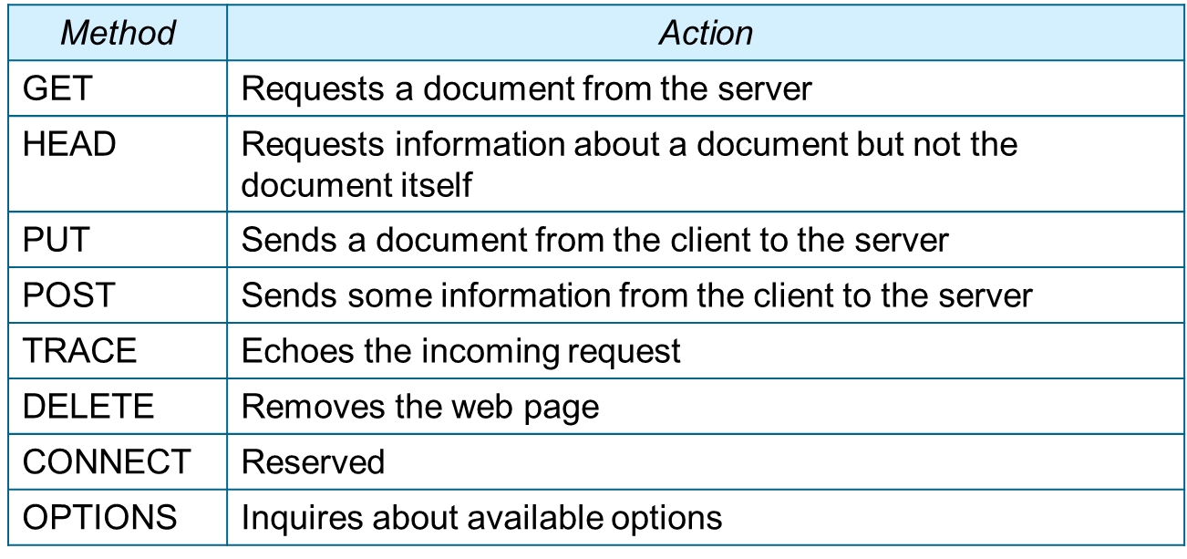 - 메소드 필드는 요청 메시지의 유형을 정의 - HTTP 버전 1.1에서는 여러 개의 메소드가 정의 - 대부분 클라이언트는 요청 메시지를 송신할 때 GET 메소드를 사용하며, 이 경우에 메시지의 본문은 비어 있음 - HEAD 메소드는 클라이언트가 서버로부터 웹 페이지에 대한 어떤 정보(예를 들어 마지막 변경 시간 등)가 필요할 때 사용하며 또한 URL의 유효성 검사에도 사용될 수 있으며, 이 경우 응답 메시지는 본문은 비어 있고 헤더 구역만 존재 |