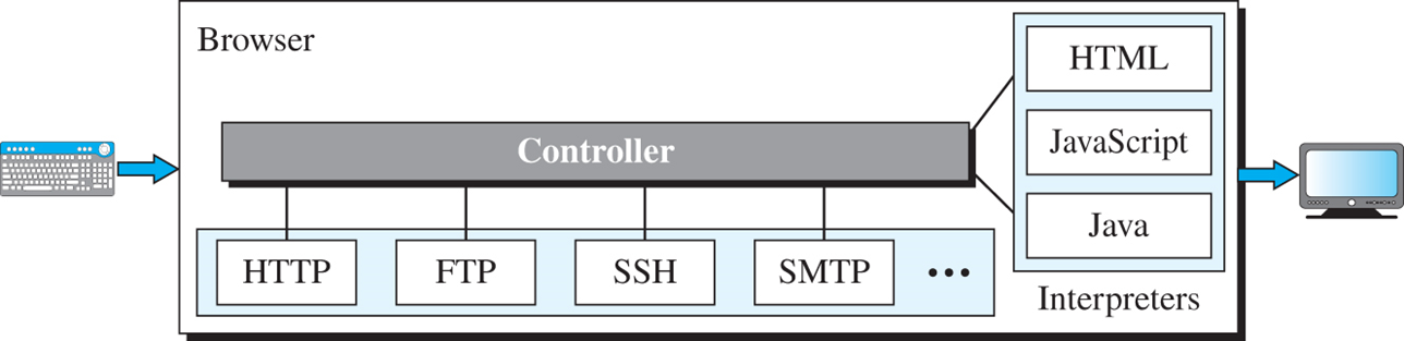 - 문서에 접속한 후 제어기는 해석기 중 하나를 사용하여 문서를 화면에 나타냄 - 클라이언트 프로토콜은 FTP나 HTTP와 같은 다음에 설명할 프로토콜 중의 하나가 될 수 있음 - 해석기는 문서의 유형에 따라 HTML, 자바(JAVA) 또는 자바 스크립트(JavaScript)가 될 수 있음 - 상업적인 브라우저에는 인터넷 익스플로러(에지), 파이어폭스, 크롬등 |