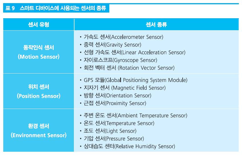 | 주변 온도 센서 - 스마트 디바이스 주변의 온도를 측정하는데 이용하는 센서 - 주변 온도를 섭씨 온도로 반환한다. 온도 센서 - 디바이스의 온도를 측정하는 센서 - CPU의 발열량을 측정하기 위한 목적으로 만들어졌다. - 최근에는 주변 온도 센서로 대체되어 더는 이용되지 않는다. 조도 센서 - 디바이스 주변의 빛의 밝기를 측정하는 센서 - 일반적으로 1 lux에서 30,000 lux 사이의 측정 범위를 갖는다. - 근접 센서가 없는 디바이스에서는 제한적이지만 근접 센서 역할을 할 수도 있다. 기압 센서 - 대기압을 측정하는 센서 - hPa, mbar 단위로 반환된다. - 기압 센서는 고도와 기상 상태를 가늠할 수 있는 정보로 기상 상태에 따라 수시로 변하는 물리량이다. - 고도의 변화를 감지하는데 사용된다. 상대 습도 센서 - 공기 중에 포함되어 있는 수분의 양 또는 비율을 측정하여 백분률(%)로 반환한다. - 주변 온도 센서의 측정값과 함께 이슬점이나 절대 습도를 계산하는데 이용된다. |