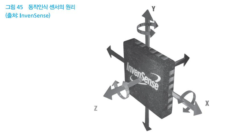 동작인식 센서로 분류되는 센서는 3축에 대해 가속력과 회전력을 측정하여 스마트 디바이스의 움직임을 알려주는데 이용된다.