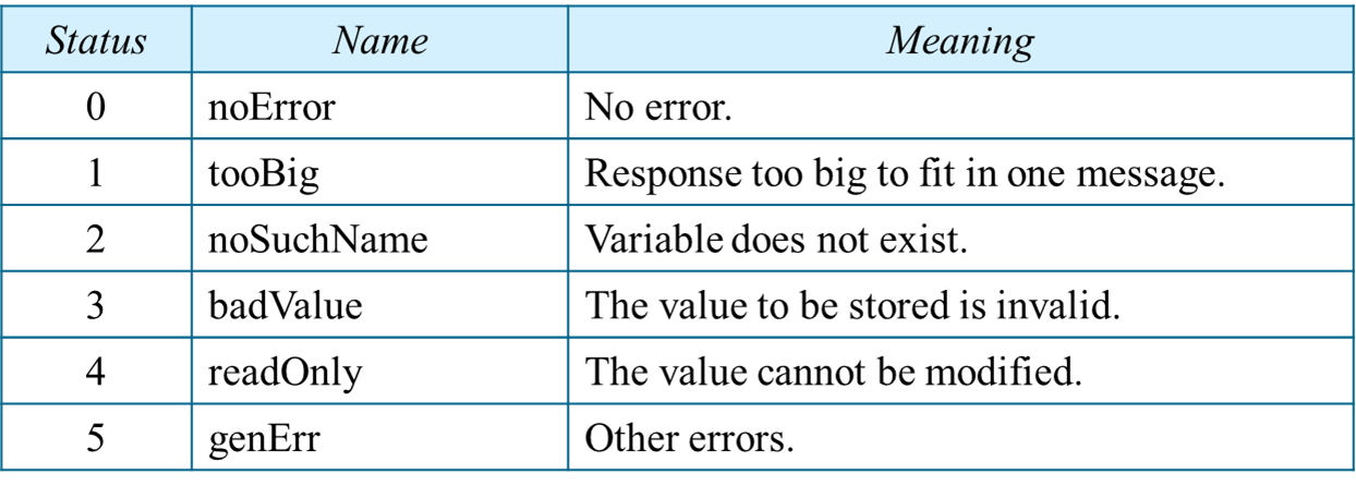 - 응답 PDU에서만 사용되는 정수로써 에이전트에 의해 보고되는 장애의 종류를 나타냄.