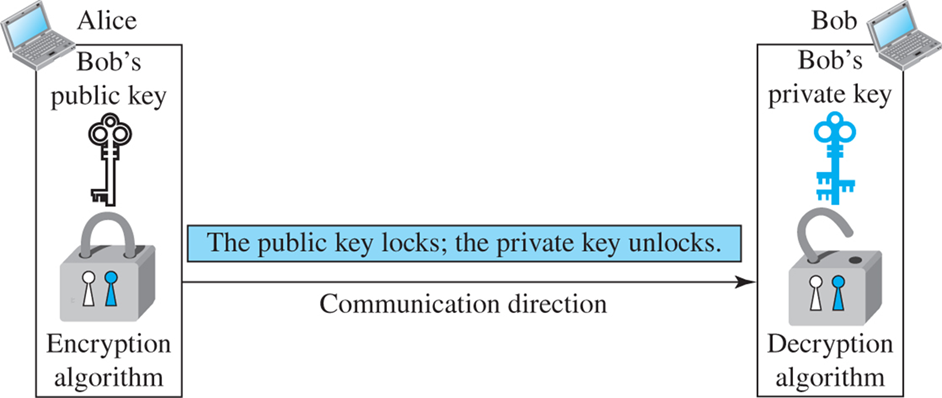 암호화와 복호화를 열쇠로 자물쇠를 잠금 및 해제하는 것으로 생각하는 경우, 공개 키로 잠긴 자물쇠는 대응하는 개인 키를 사용하여 잠금을 해제 가능