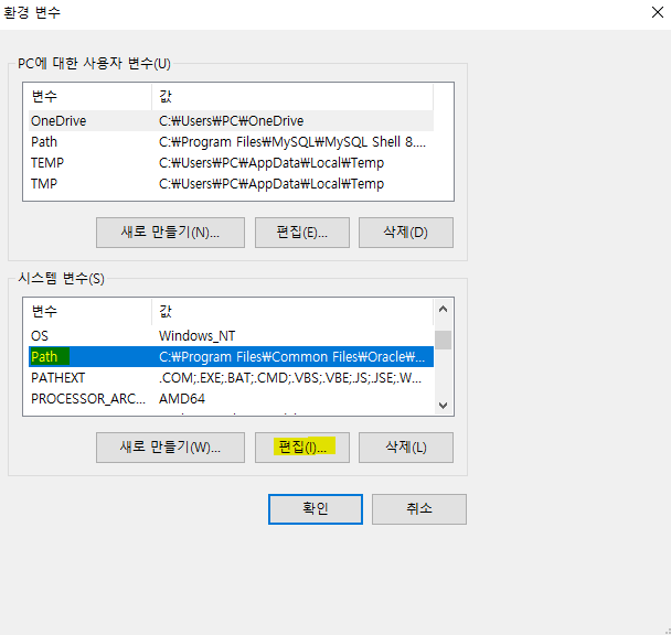 시스템 변수에서 Path를 찾아 클릭하고 편집을 클릭한다.