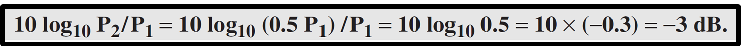 *예제) 신호가 전송매체를 통해 이동하고 있고 전력(power)이 절반으로 줄었다고 하자. 이것은 P2는 (1/2)P1임을 의미한다. 이 경우에, 감쇠(전력 손실)은 다음과 같이 계산할 수 있다.