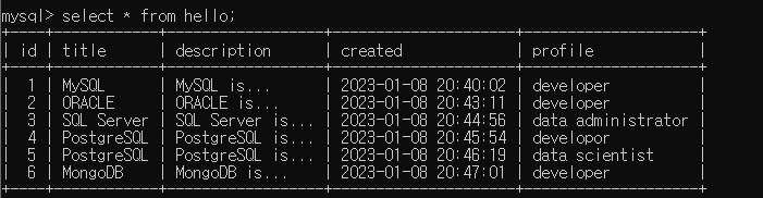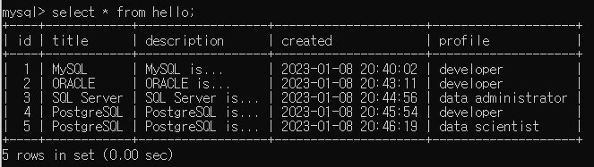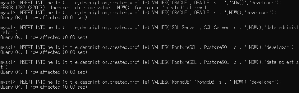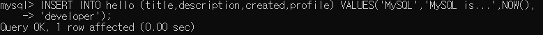 INSERT INTO hello (title,description,created,profile) VALUES('MySQL','MySQL is...',NOW()