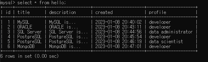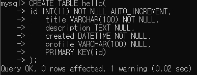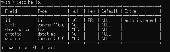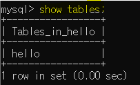 hello라는 테이블이 잘 만들어진 것을 볼 수 있다.