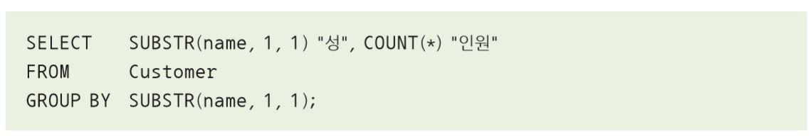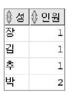 예제) 마당서점의 고객 중에서 같은 성을 가진 사람이 몇 명이나 되는지 성별 인원수를 구하시오.