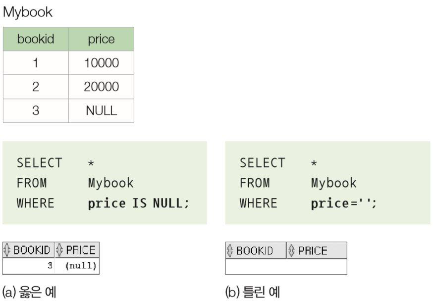- NULL값을 찾을 때는 = 연산자가 아닌 IS NULL을 사용