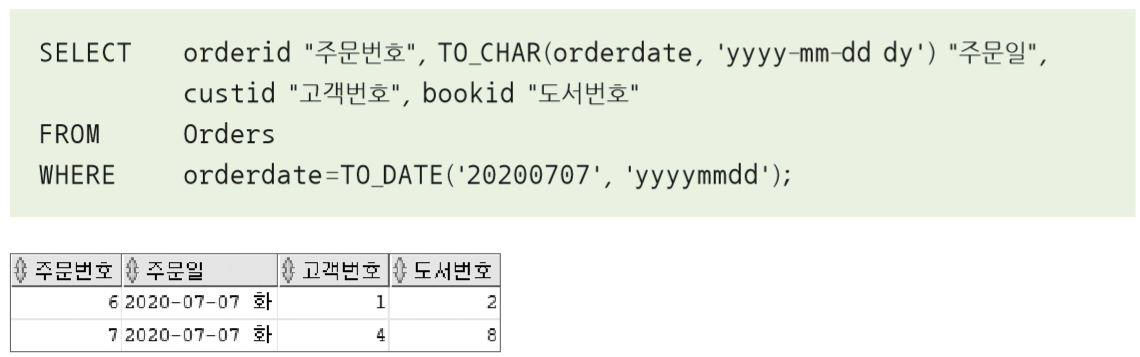 예제) 마당서점이 2020년 7월 7일에 주문받은 도서의 주문번호, 주문일, 고객번호, 도서번호를 모두 보이시오.