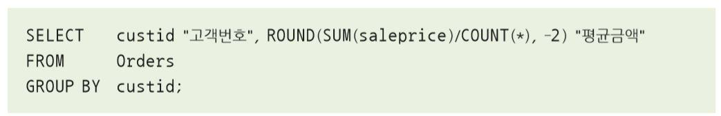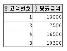 예제) 고객별 평균 주문 금액을 백원 단위로 반올림한 값을 구하시오.