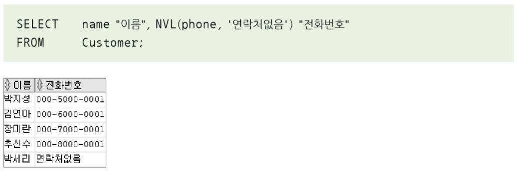 예제) 이름, 전화번호가 포함된 고객 목록을 보이시오. 단, 전화번호가 없는 고객은 '연락처없음'으로 표시한다.