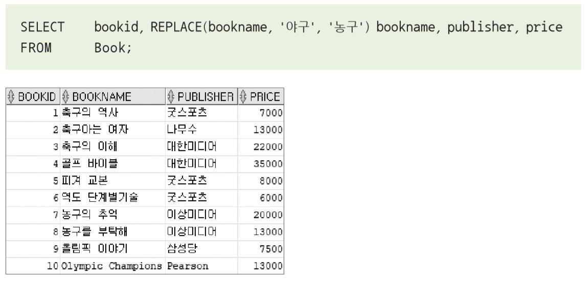 예제) 도서 제목에 야구가 포함된 도서를 농구로 변경한 후 도서 목록을 보이시오.