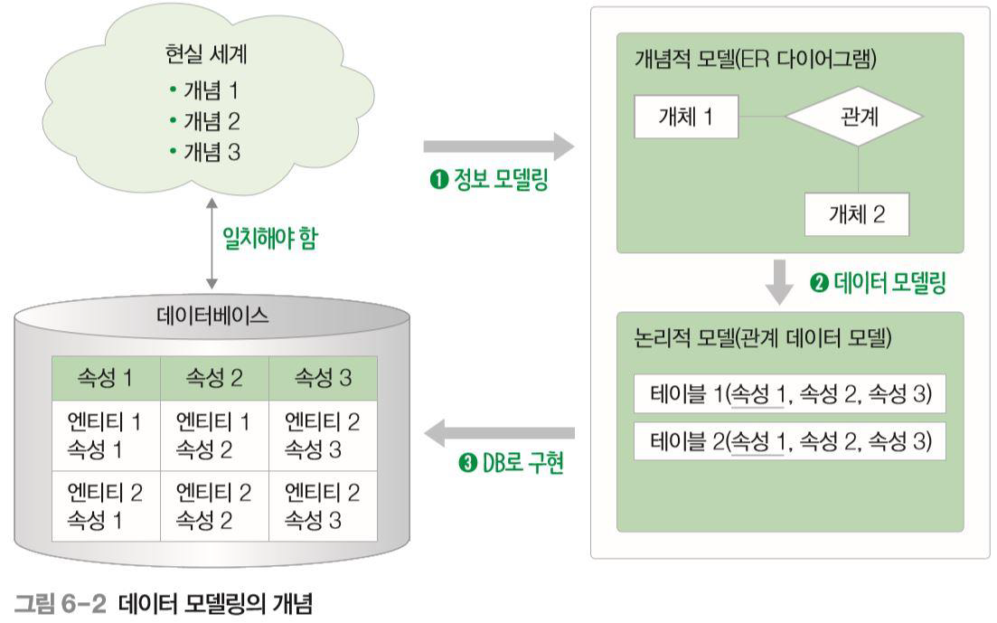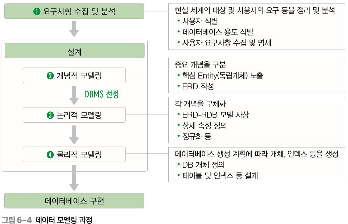 | 3. 논리적 모델링 | 개념적 모델링에서 만든 ER다이어그램을 사용하려는 DBMS에 맞게 사상하여 실제 데이터베이스로 구현하기 위한 모델을 만드는 과정 |