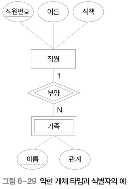 - 상위 개체 타입이 걀정되지 않으면 개별 개체를 식별할 수 없는 종속된 개체 타입