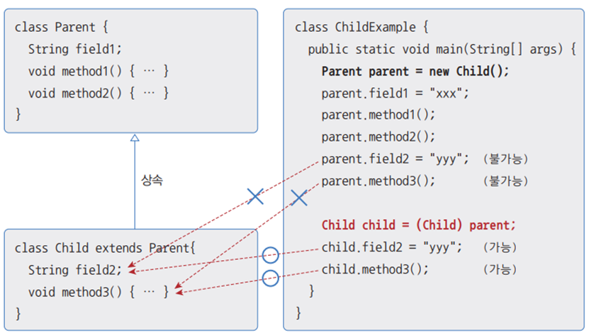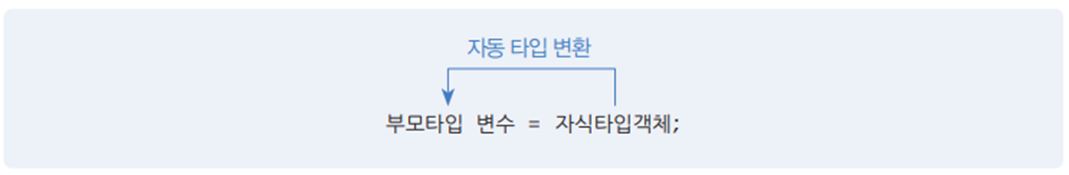 자식 타입은 부모 타입으로 자동 변환되지만, 반대로 부모 타입은 자식 타입으로 자동 변환되지 않는다.