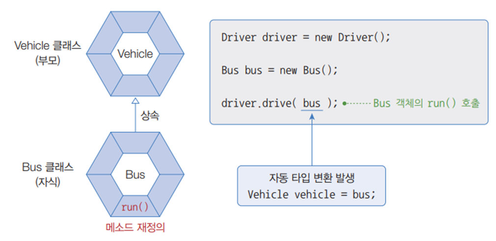 다형성을 구성하기 위해서는 자동 타입 변환과 메소드 재정의가 필요하다.