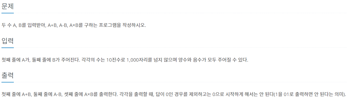첫째 줄에 A+B, 둘째 줄에 A-B, 셋째 줄에 A×B를 출력한다. 각각을 출력할 때, 답이 0인 경우를 제외하고는 0으로 시작하게 해서는 안 된다(1을 01로 출력하면 안 된다는 의미).