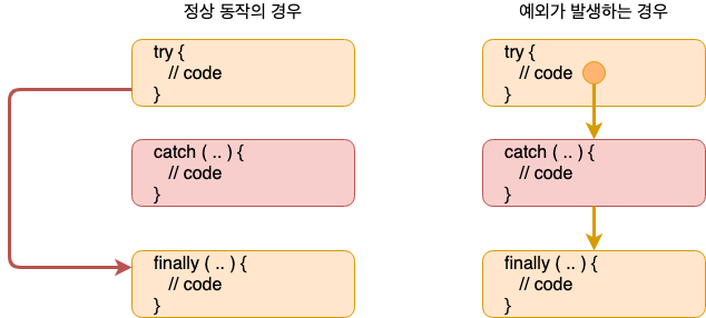 try 블록 정상 실행: catch 블록 실행 X, finally 블록 실행 O