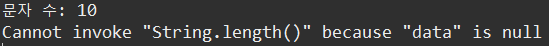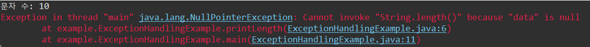 null 값을 대입한 printLength(null); 부분에서 예외가 발생한다.