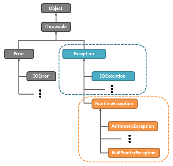 - 예외: 잘못된 사용 또는 코딩으로 인한 오류를 말한다. 예외 처리를 통해 계속 실행 상태를 유지할 수 있다.