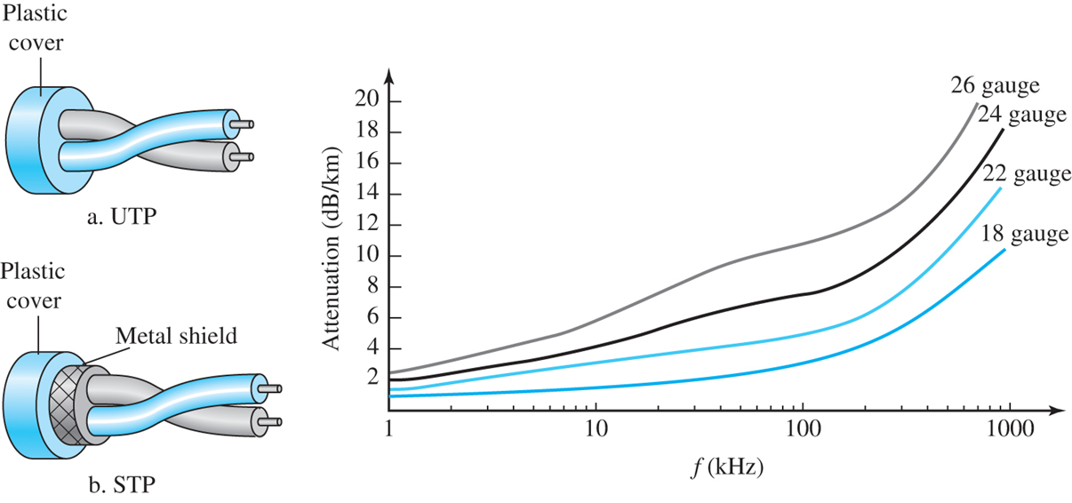 - 비차폐선(UTP: Unshielded Twisted-Pair) 케이블: 오늘날 통신매체에서 사용하는 가장 일반적인 형태